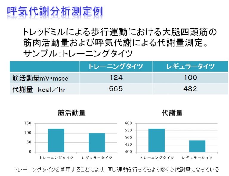 呼気代謝分析 体の中で消費される酸素の量を測定することで、全身のエネルギー消費量を把握することが可能となります。 例えば、同じ動作を行っても衣服素材や形状の影響によってエネルギー消費量は大きくなったり逆に小さくなったりします。 評価方法一覧へ戻る